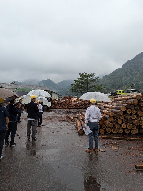 工場前には近くの山林から切り出した丸太が並んでいました。