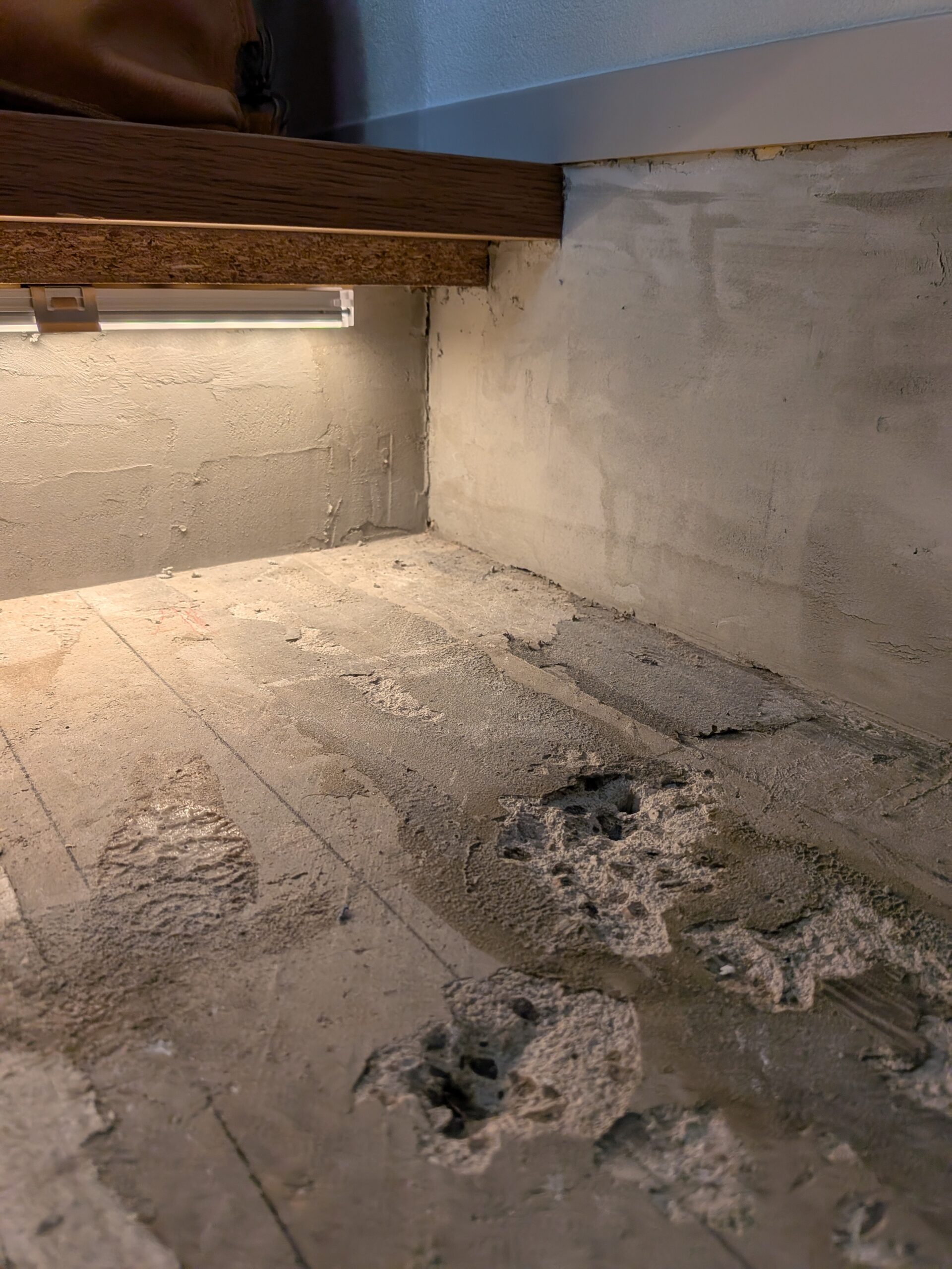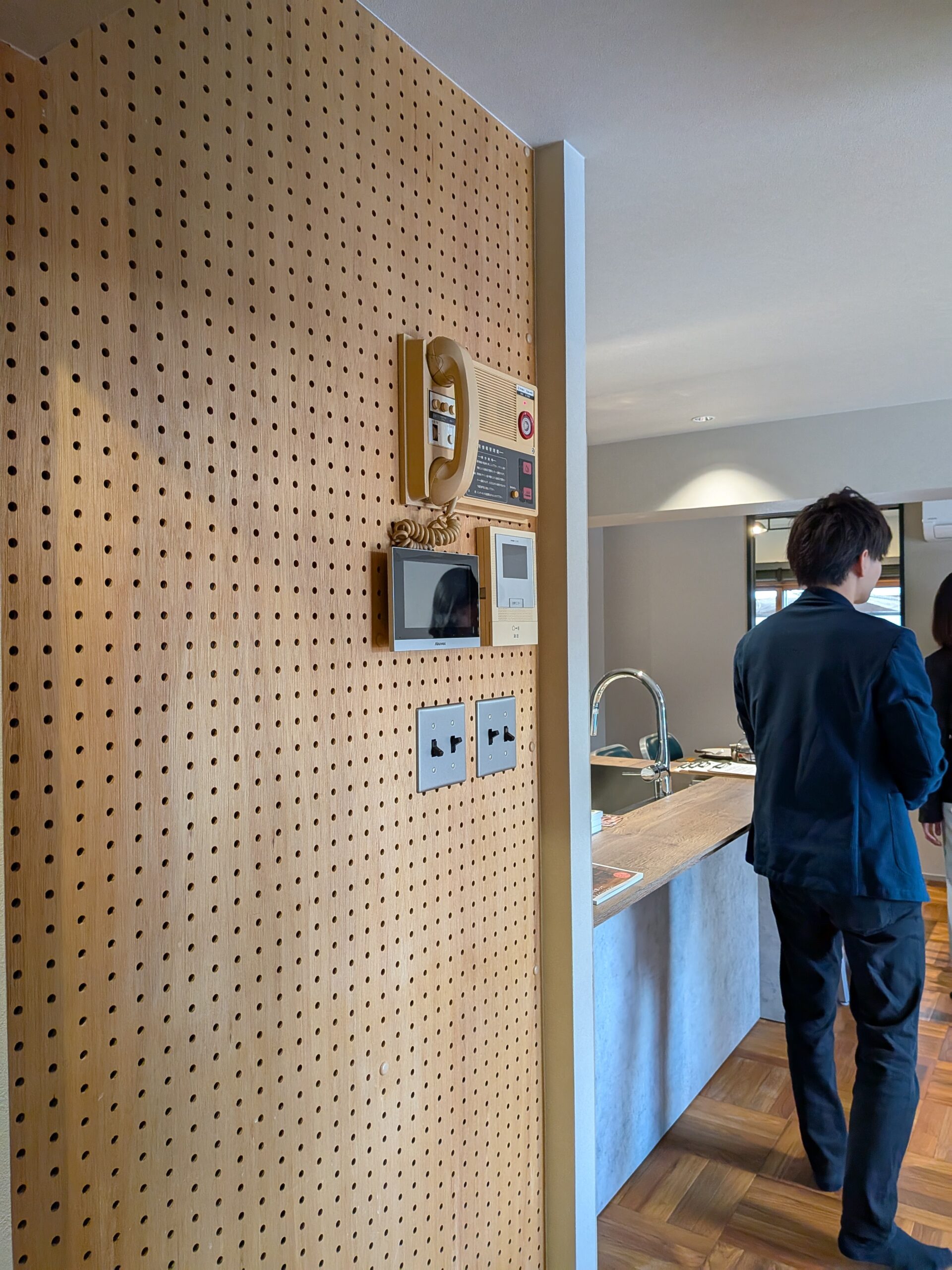 マンションならではの交換できないインターホンなどもかなり年季が入っているのですが、有孔ボードとの組み合わせで味のある雰囲気に…