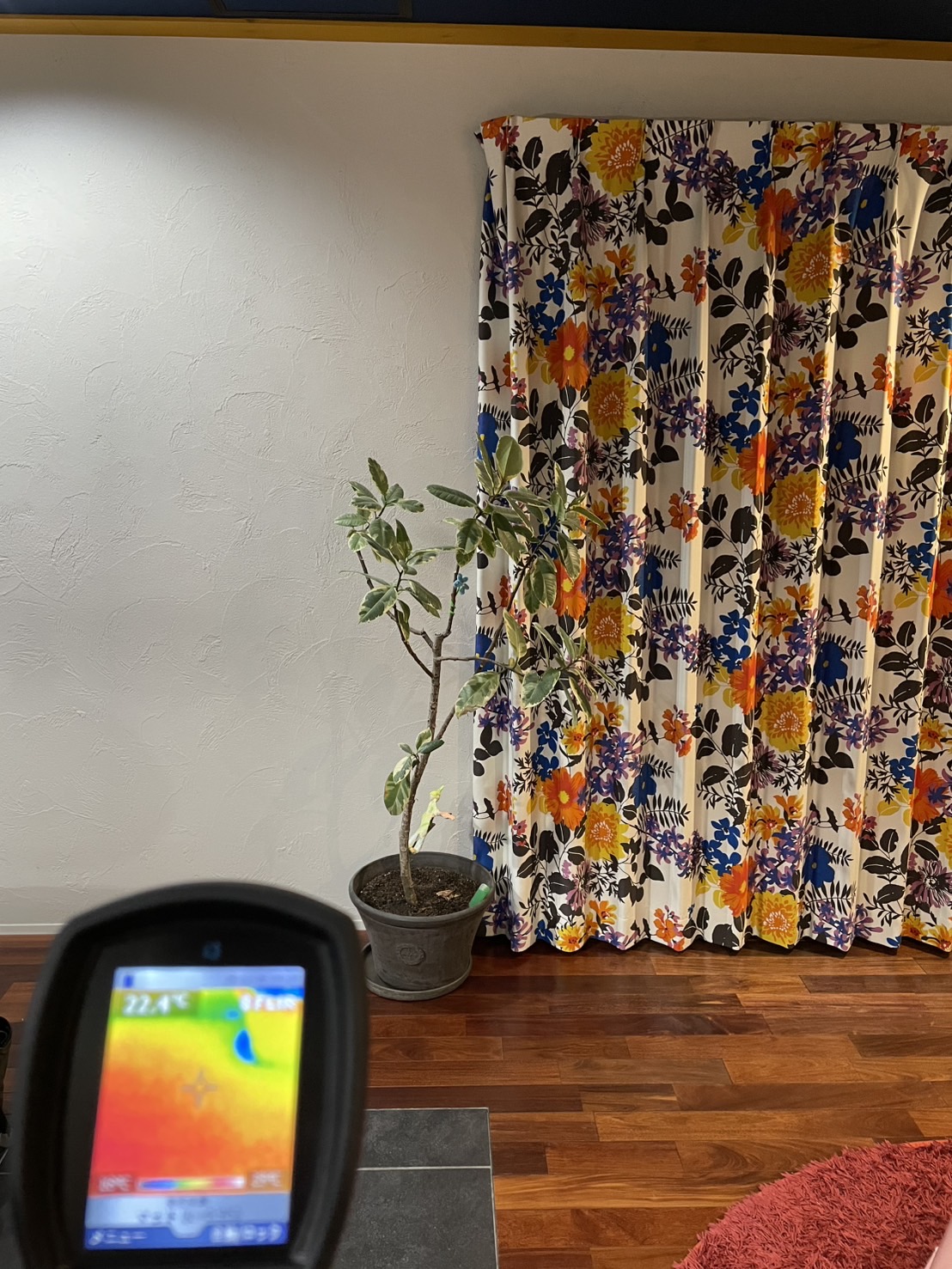観葉植物のすぐ下のフローリング表面温度を見ると、22.4℃以上。