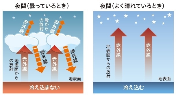 なので、『曇天』曇りの日は雲がフィルターのような働きで放射冷却の影響が和らぎます。