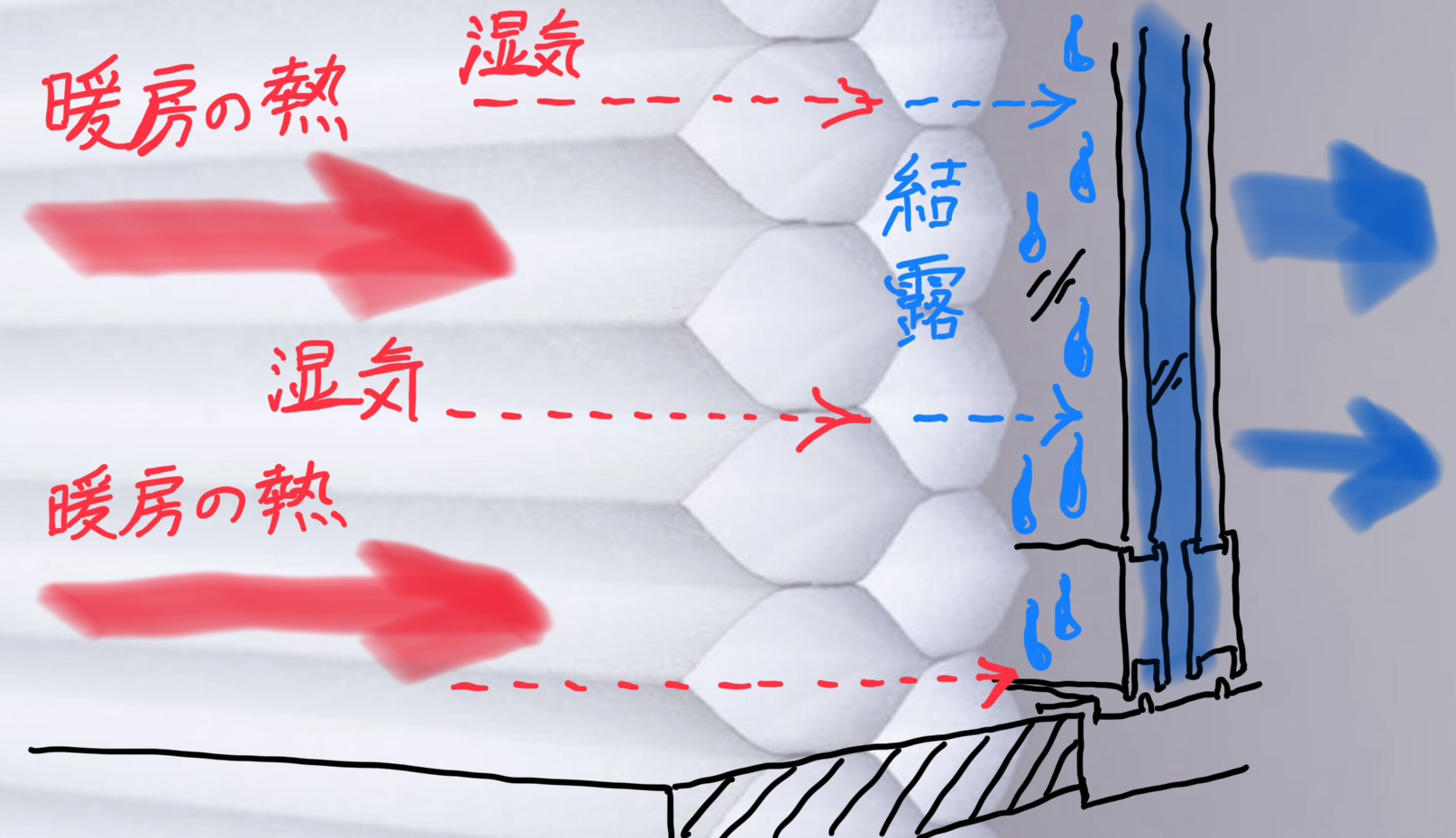 このため窓に温度が行き渡らず、温度差が激しくなり透過した湿気は水滴に変化し結露します。