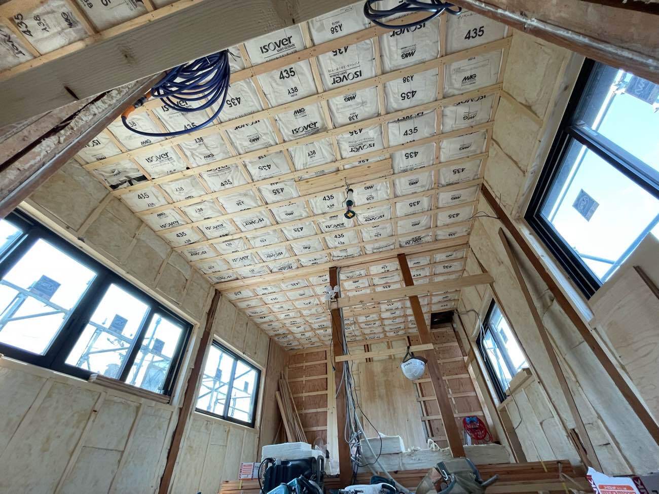 ↑カスケホームでは間仕切壁の上であっても空洞部を作らないようビッシリと断熱材を入れていきます。
