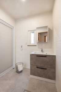 水まわりは、白とグレーをベースにシンプルに。