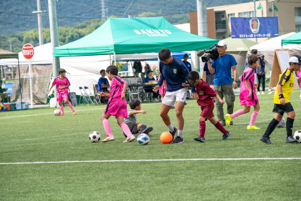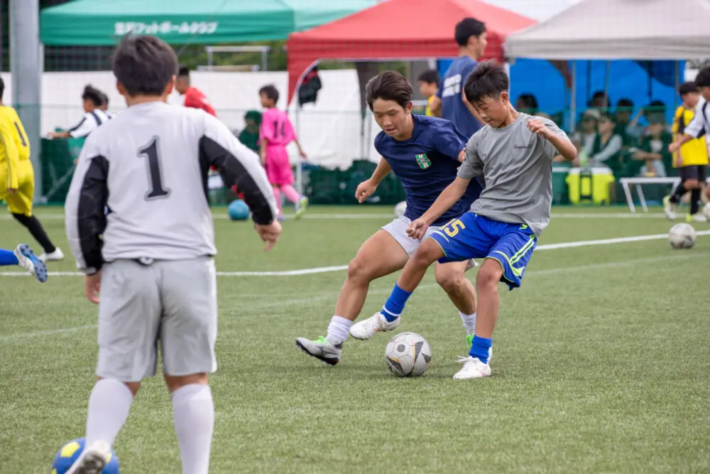 参加した子どもたちはサッカー強豪校で活躍する部員の指導の下、ドリブルやパス、シュートの基本を楽しみながら体験。