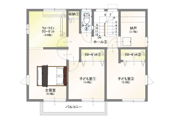 2×4構造で大きな間取り変更が難しい中、収納を強化し、各部屋の収納やパントリー、2階にはファミリークローゼットと納戸を計画。