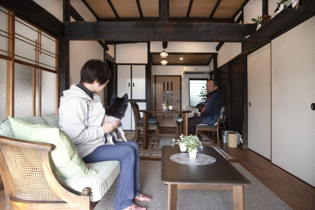 おばあちゃんが使っていたソファを張り替えて置いているのですが、そこは飼っている犬が一番気に入って占領しています(笑)。あと、妻の嫁入り道具のテーブルを離れから二人で運んできたのですが、この部屋の床や梁の色とすごく合っていて、とても落ち着く空間になりました。