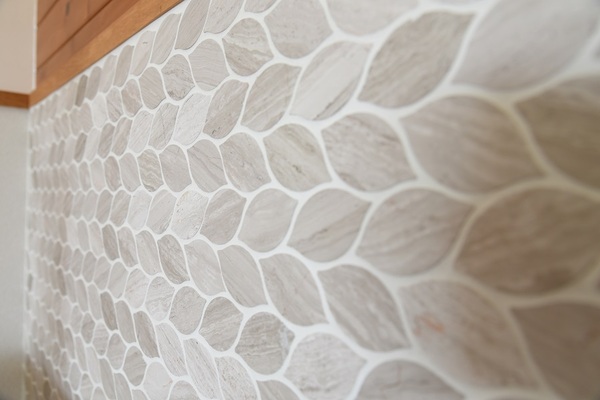 | LDKと隣接する洋室には既存の壁板に合うように葉っぱ型の飾りタイル を使い、部屋全体が柔らかく明るい雰囲気になるよう演出しました。 |