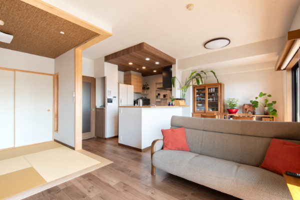 キッチンや和室の仕切を一部撤去し、開放的な空間に。開放的な中にも下がり天井やアクセントクロスでメリハリの付いたLDKとなっています。