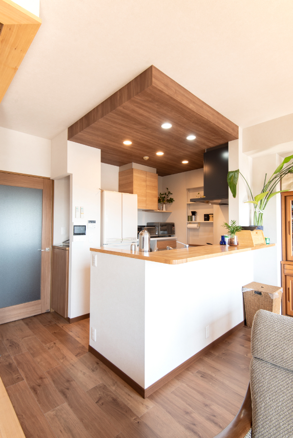 | 下がり天井に木目のクロスを貼り、空間にメリハリを付けました。 | 吊り戸をなくした分の収納は背面収納を配置することでカバー。また、ニッチを新設することで、調味料やちょっとした小物などディスプレイも置くことができます。 |