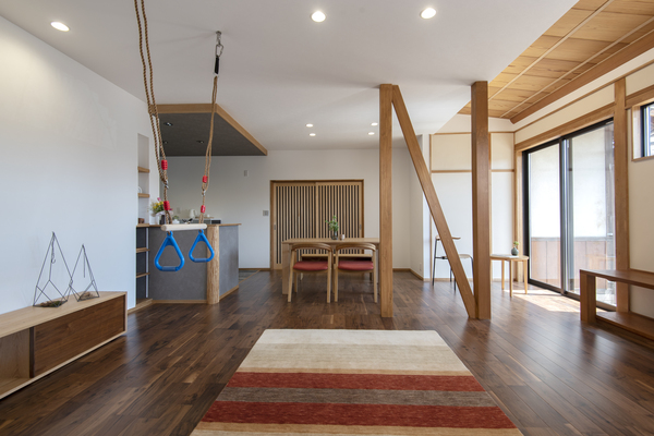 | あまり使われていなかった南の和室4部屋を、廊下も取り込みつつ大幅に間取を変更。ご家族が集まるLDKにはハンモックや遊具を取り付けられるよう天井に金具を取り付けています。 構造上取ることのできない柱や筋交いもお部屋のアクセントになっています。 |