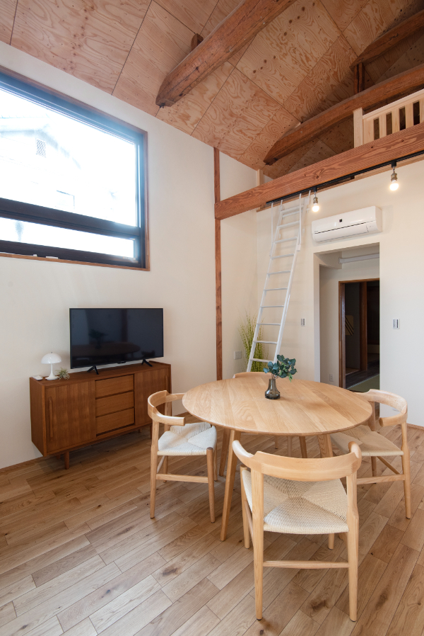 納屋だったスペースのため、限られた空間ではありますが、吹き抜けを絡めた一体的な空間構成で、狭さを感じさせないつくりになっています。