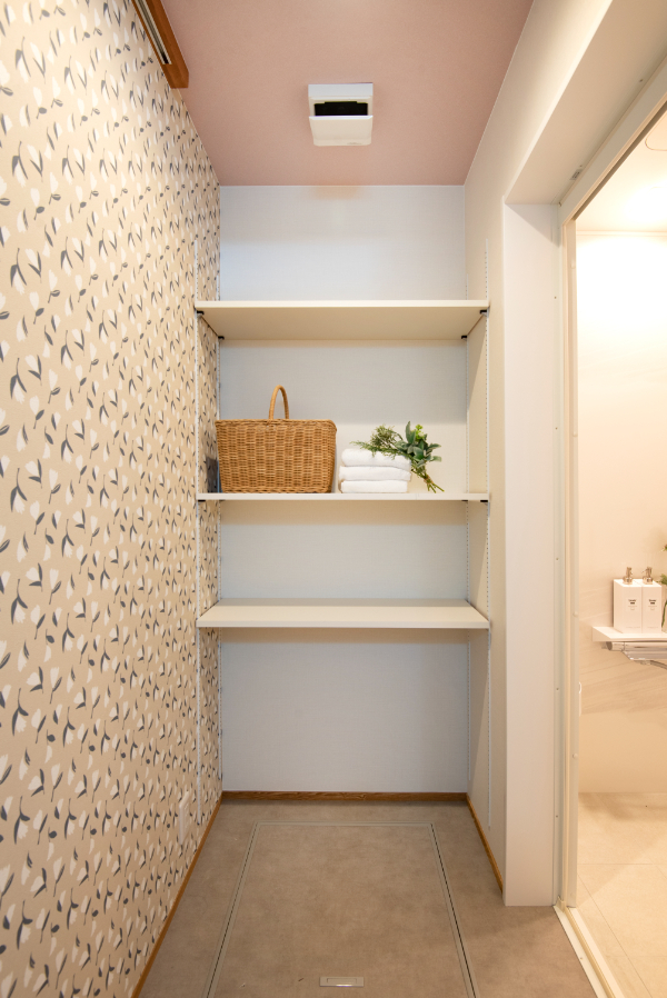 | 帰ってきてすぐに使えるように玄関近くに洗面化粧台を配置。洗面ボールは実験用流しをセレクト。広く深さのあるシンクで、子どもたちが汚してしまった服や靴を洗うのに活躍しそうです。 | 脱衣室は壁面に可動棚を設置し空間を有効活用。 壁紙と浴槽は娘さんの好きなピンク色をセレクトされました。 |