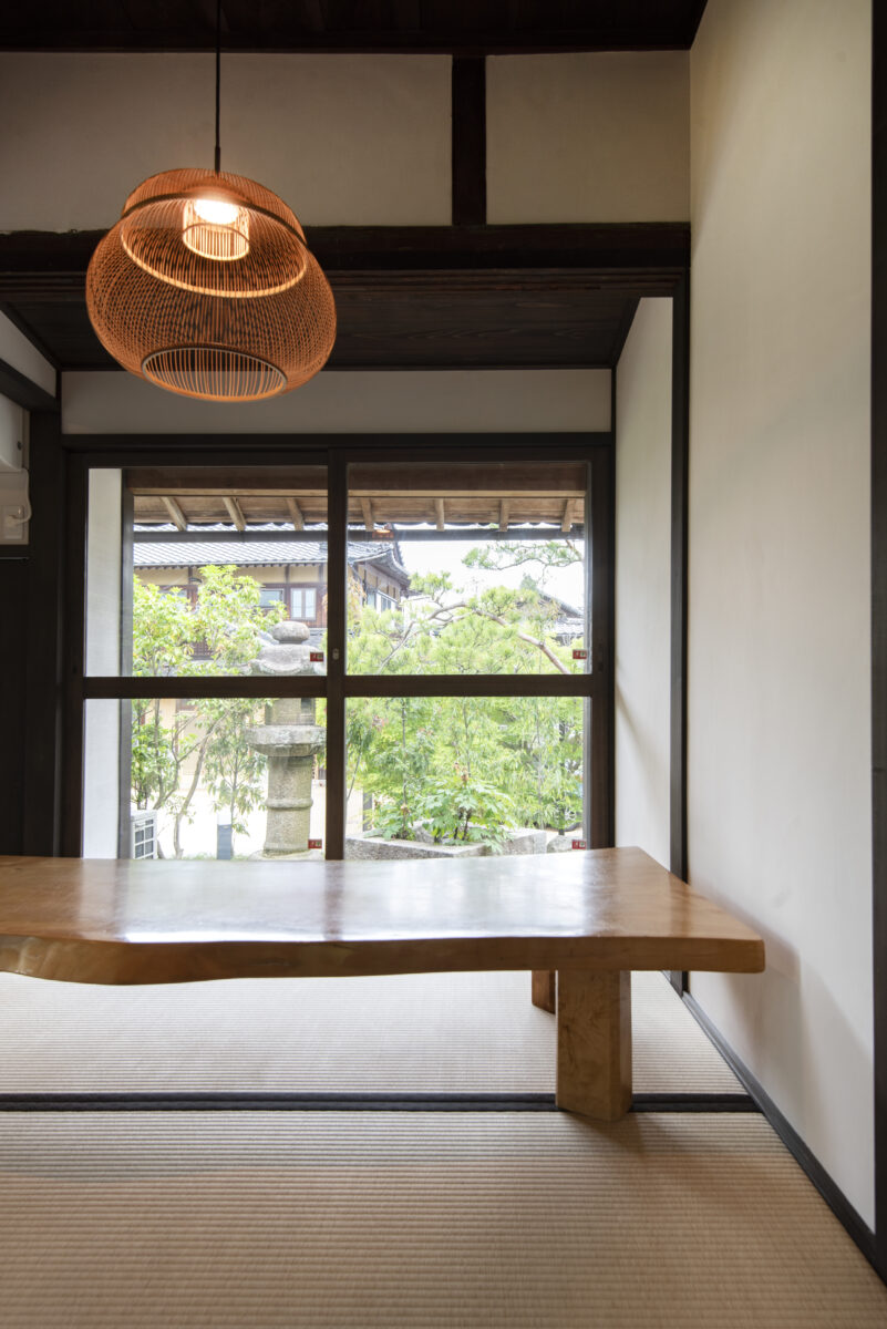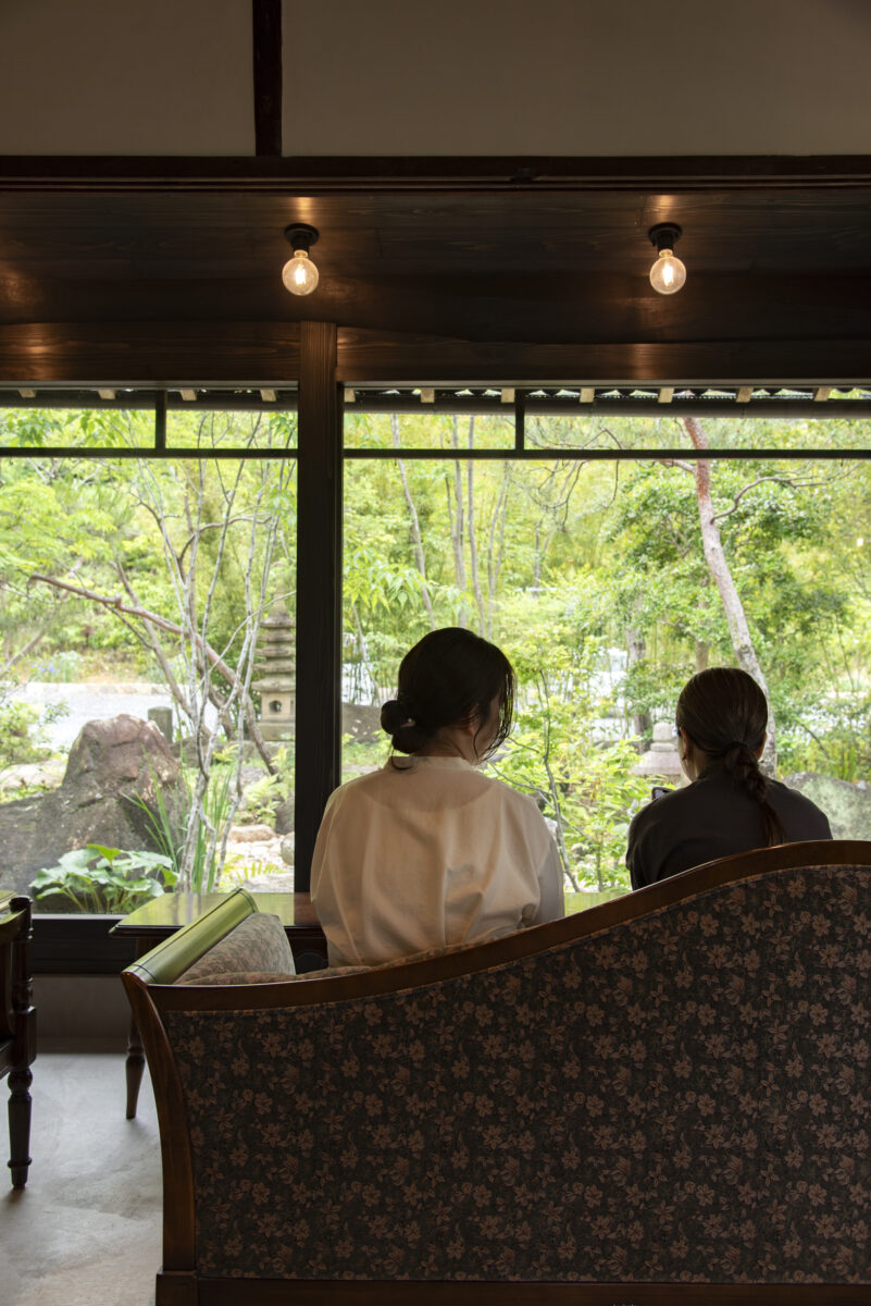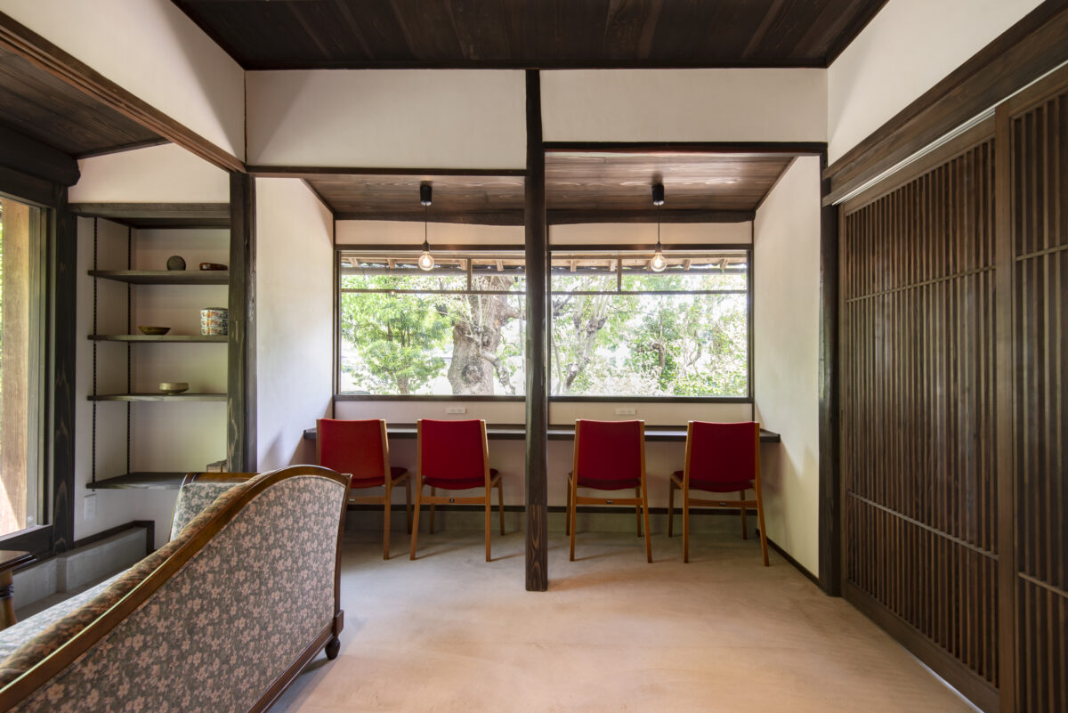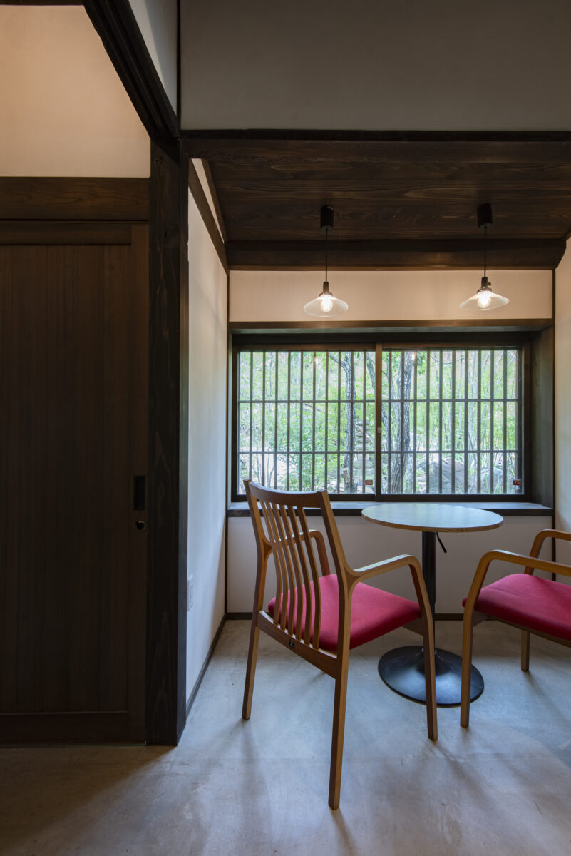 開口部の配置や座席レイアウトは、お客様の視線の先に自然が広がるように計画しました。伝統的な意匠を生かしながら、現代のカフェとして快適に過ごせる機能性を融合させた、心安らぐリノベーションです。