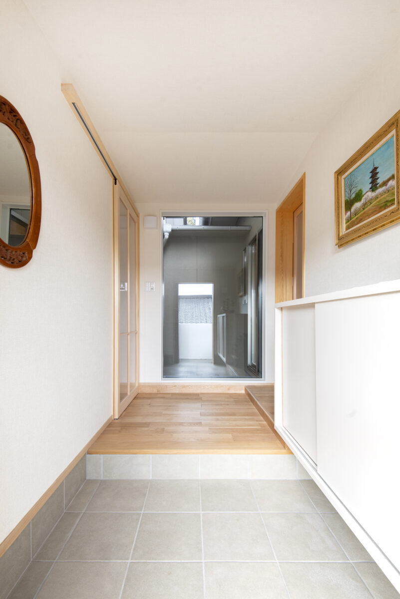 必要量の玄関収納を設けた玄関の先には中庭が広がり、広さ・つながり感じる玄関へ。