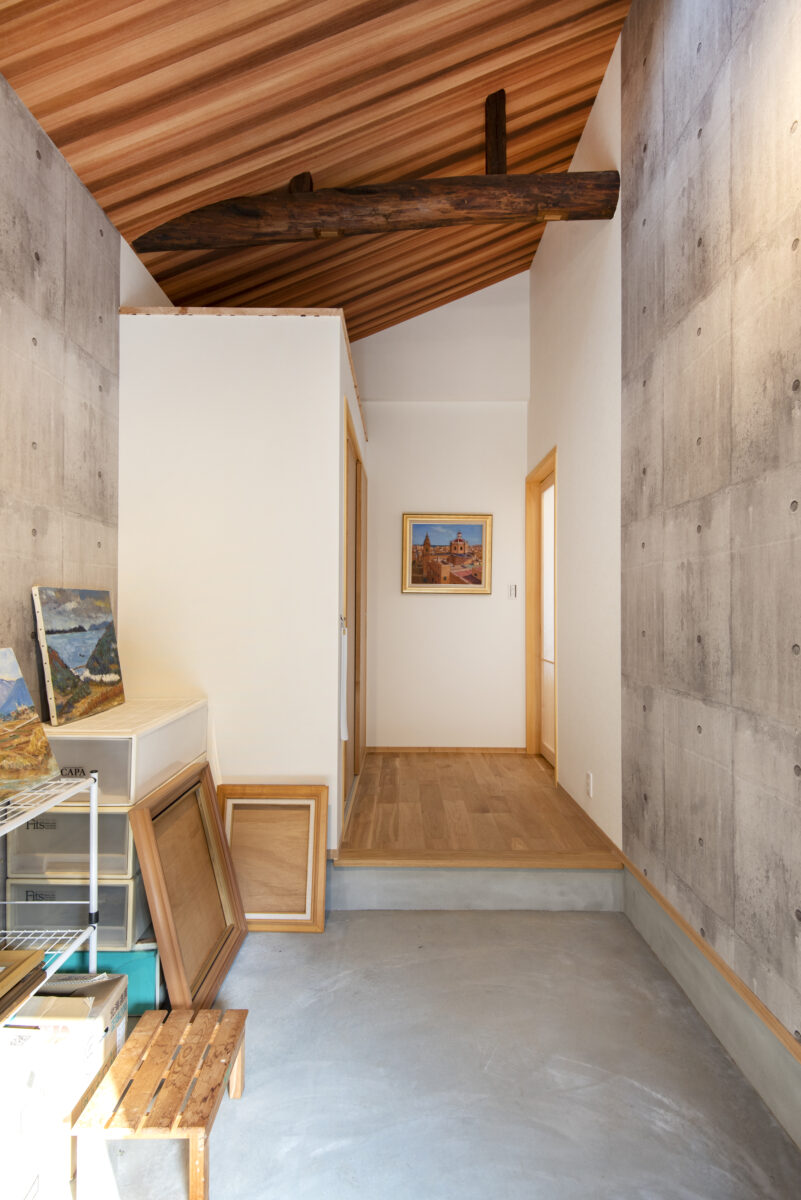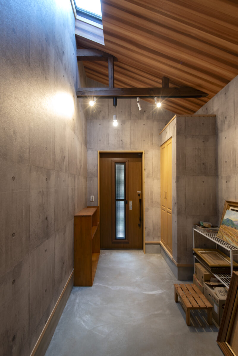また、世帯ごとに分けた玄関や、趣味のロングボードを収納できる土間玄関など、新しい生活スタイルに合わせたゾーニングをご提案しました。解体時に現れた立派な梁は、ご家族の記憶を継承するシンボルとして、あえて意匠的に残しています。